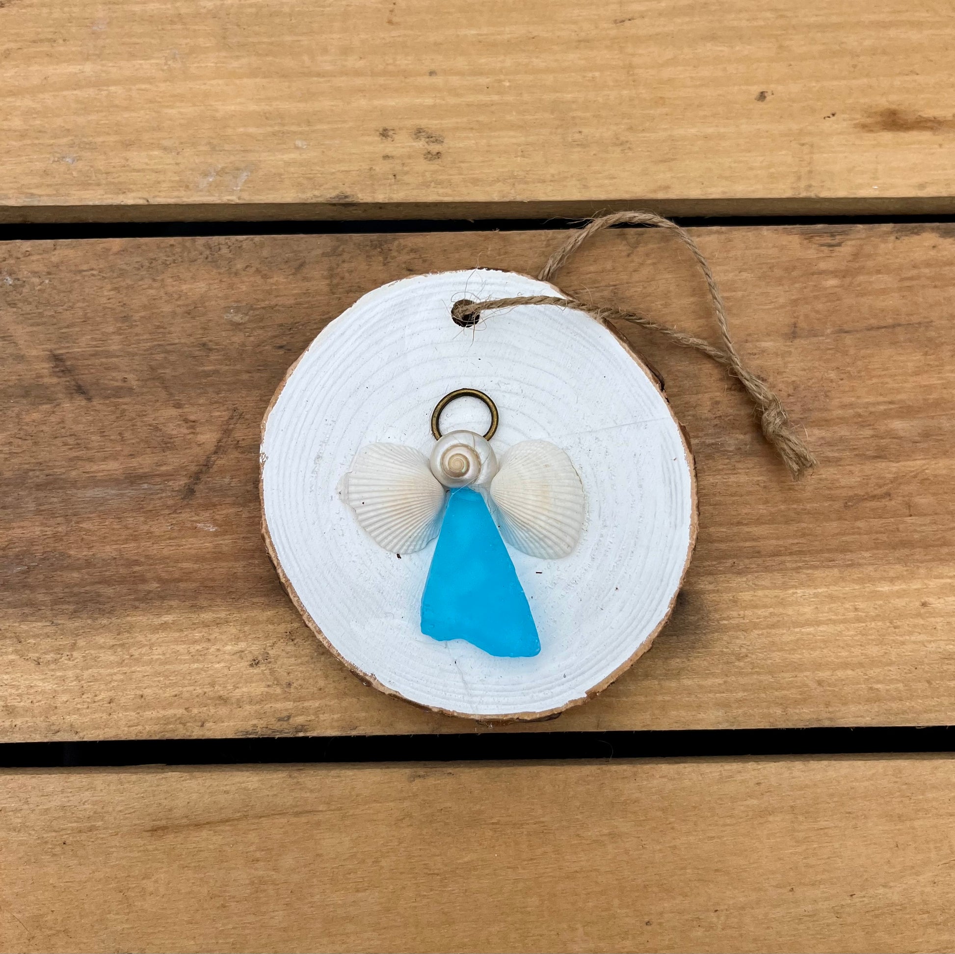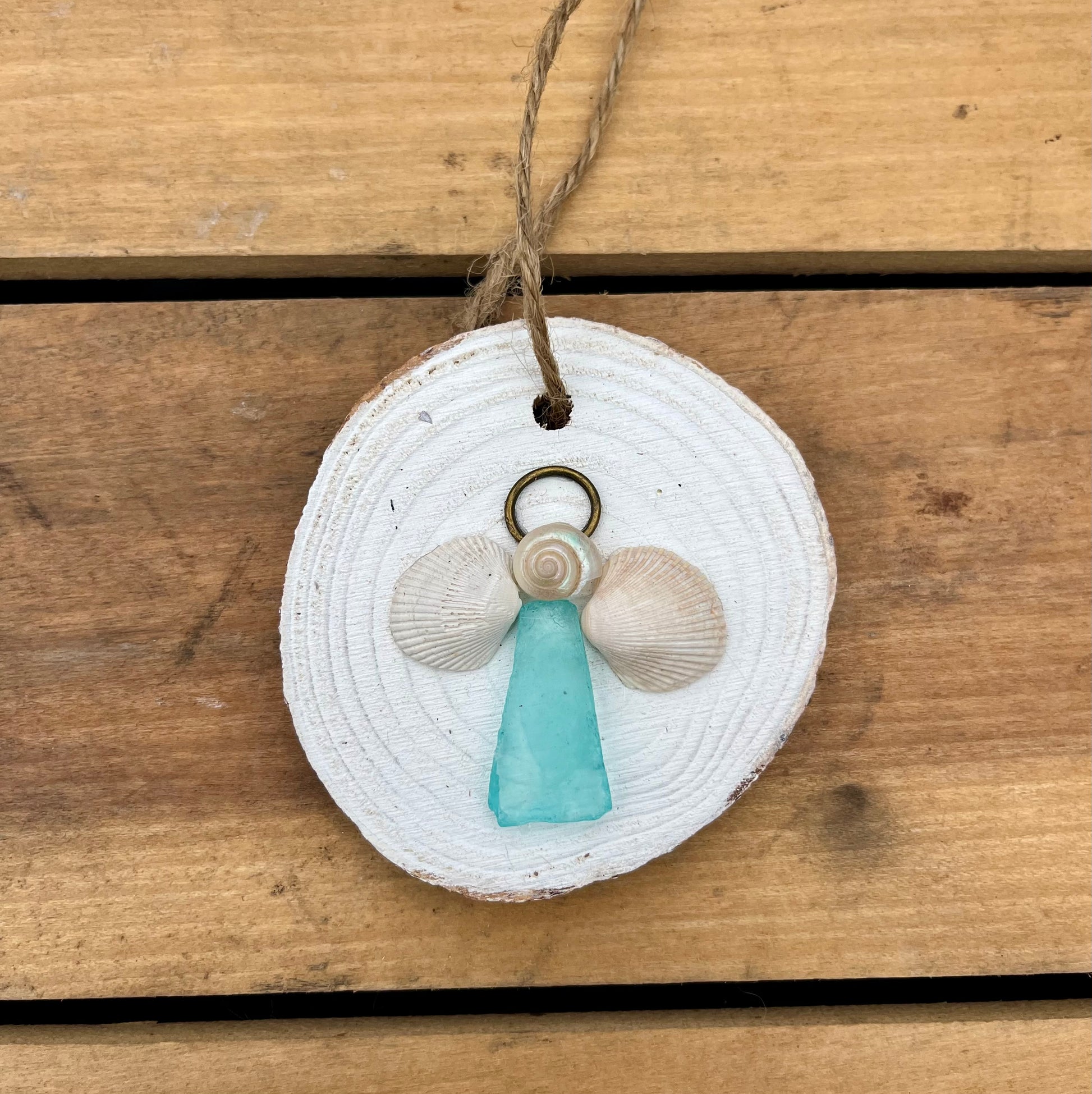 Hand painted on a slice of wood our Angel ornament is created from all natural materials. Featuring a sea glass body, a pebble head and shell wings Hangs from a red gingham ribbon.